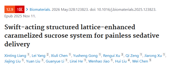 原文连接:Xinting Liang#, Lei Yang#, Xiuli Chen#, Yusheng Gong, Rengui Xu, Qi Zeng, Jiarong Xu, Jiajing Liu, Yuan Liu, Guanyue Li, Linxi He, Wenhao Jiao, Hui Liu*, Wei Chen*. Swift-acting structured lattice-enhanced caramelized sucrose system for painless sedative delivery.Biomaterials2025, DOI: 10.1016/j.biomaterials.2025.123823.
