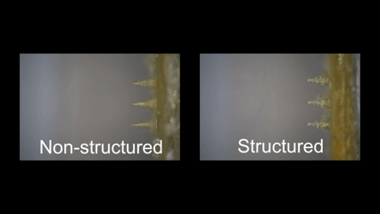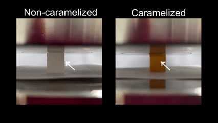 糖基微针具有溶解速度快、生物安全性好的优势,但其机械强度差,且容易吸潮结晶,稳定性差。本研究通过精细调控焦化工艺(加热至180℃形成深黄色溶液),降低结晶度,形成无定形结构。该阶段焦化产物主要为单糖、二糖和低聚糖,不产生有毒物质;基于焦化蔗糖的微针储存2天后无结晶,插入皮肤时无断裂,显著增强了其稳定性和机械强度。